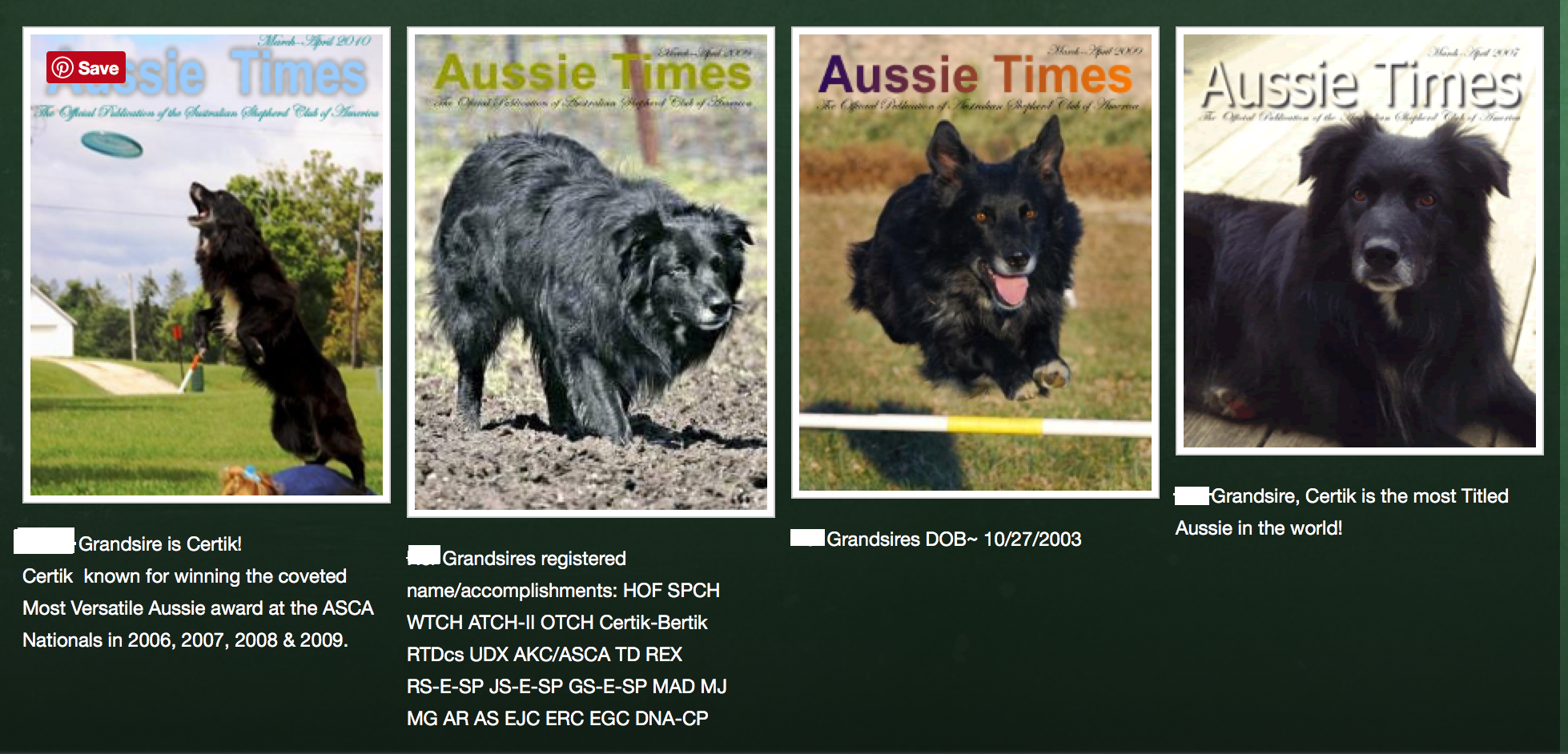 Certik Bertik,le grandpere de CALI est le Berger Australien le plus titré du monde. Sacré ressemblence dans touts les sens! CALI est venue de l'USA.